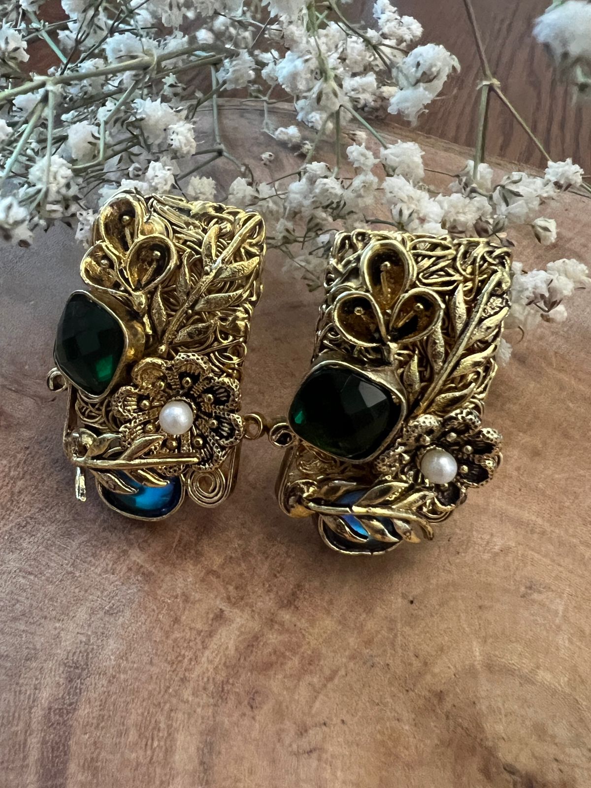 gold-detailing, emerald and blue semi-precious stones, copper-based