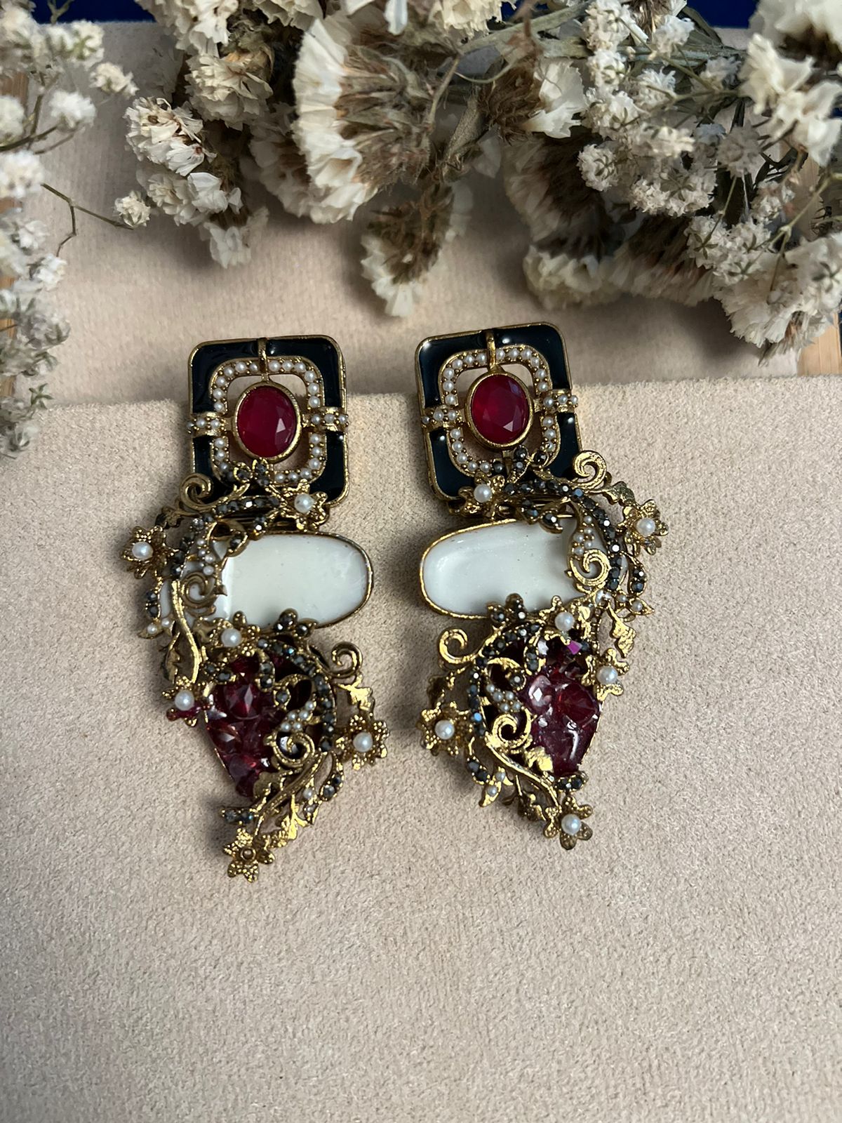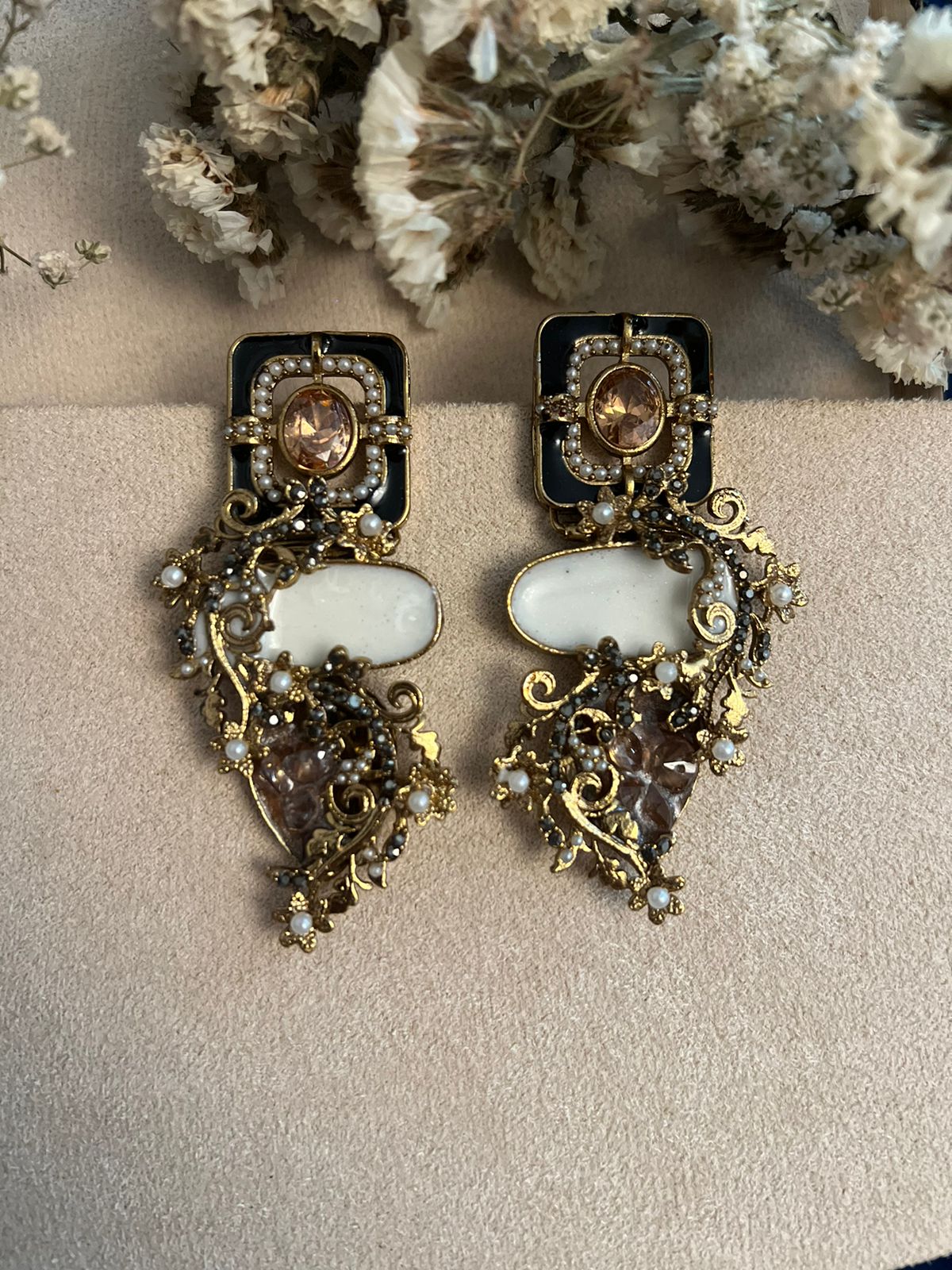 white-shell stone, gold detailing, champagne or red semi-precious stones, copper-based